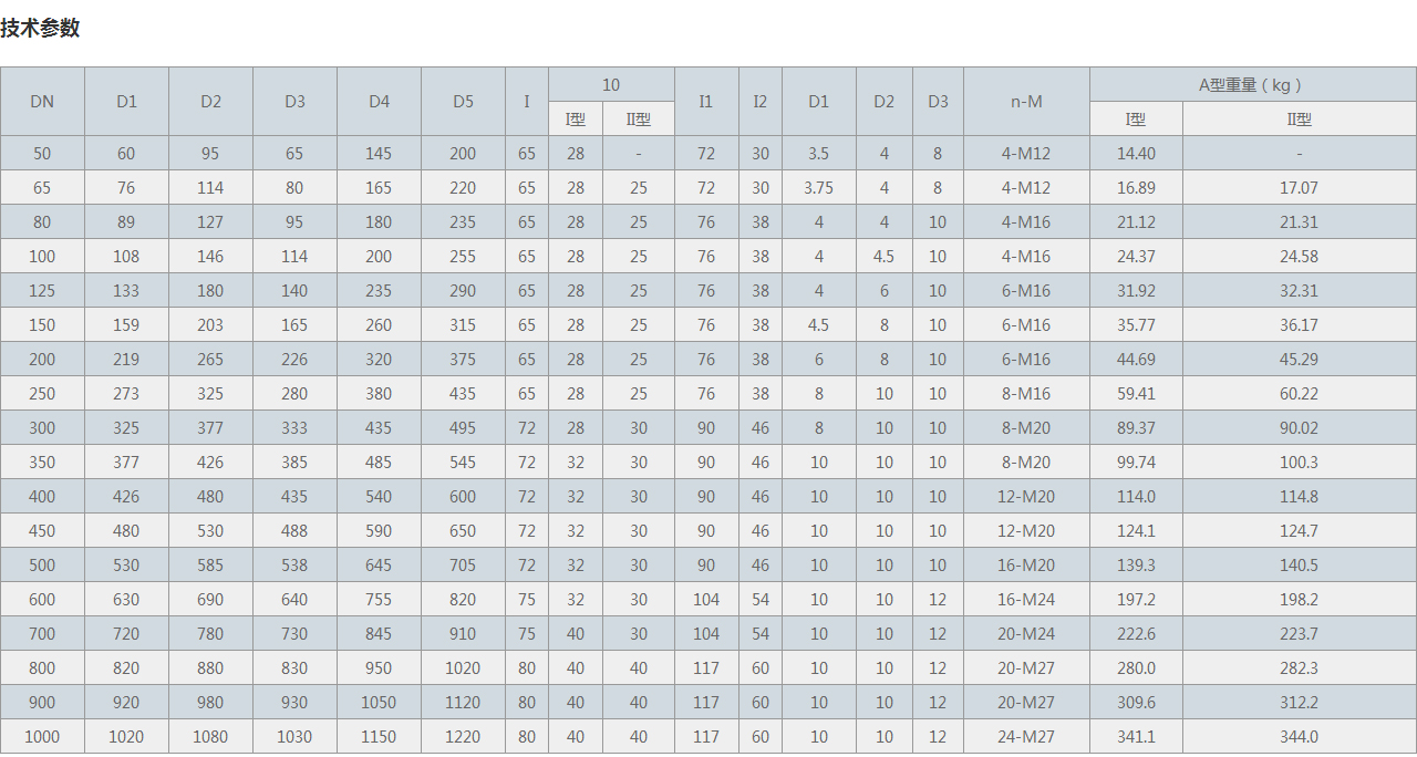 | DN | D1 | D2 | D3 | D4 | D5 | I | 10 | I1 | I2 | D1 | D2 | D3 | n-M | A型重量(kg) | ||