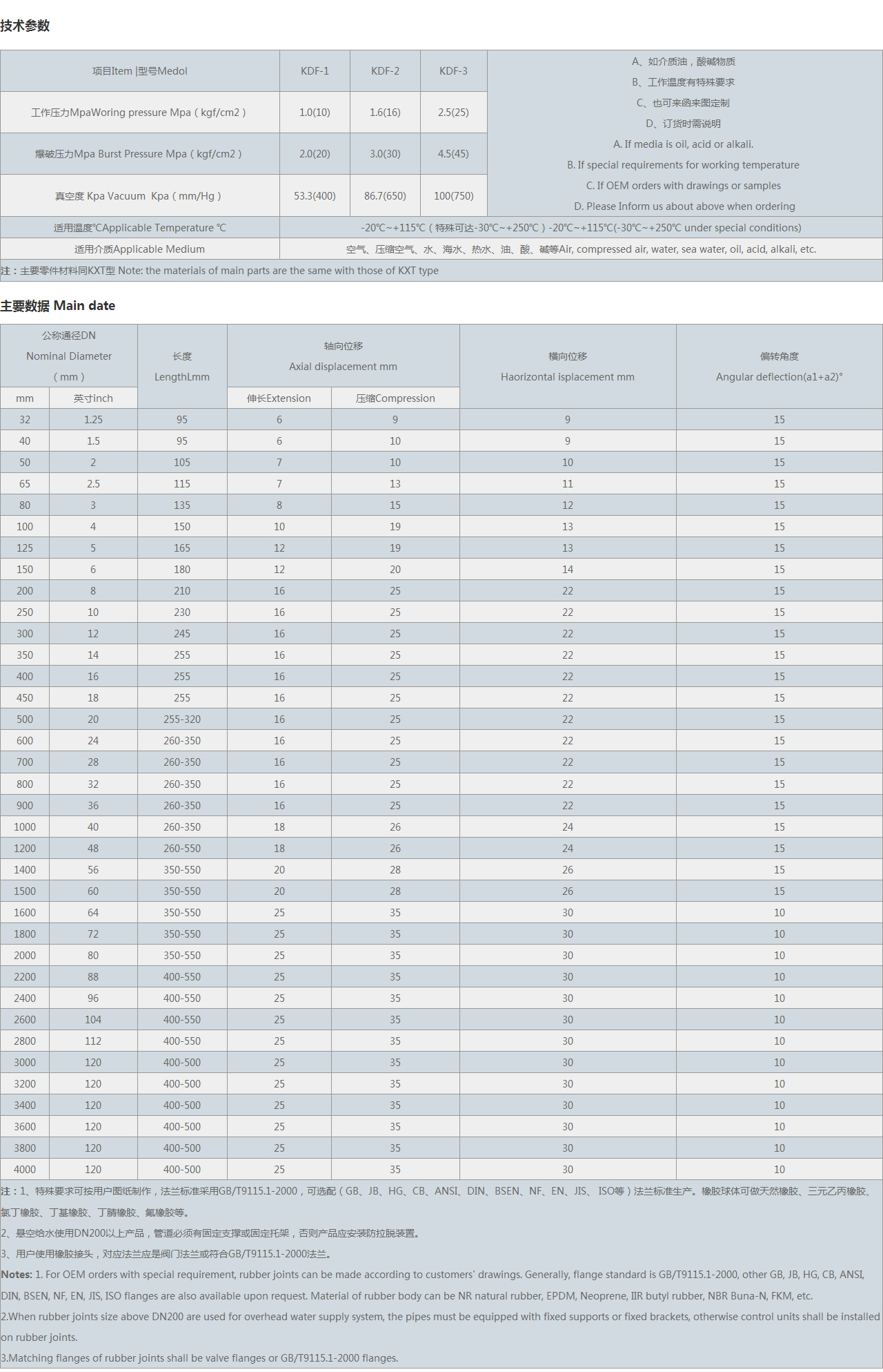 KDF翻邊型橡膠接頭是一種高彈性、高氣密性、耐介質性和耐氣候性的管道接頭。由于可曲撓橡膠軟接頭有良好的綜合性能,主要用于原水和污水的提升和輸送,火力發電廠的給水和冷卻循環水,冶金行業,冷凝水,化工行業的化學物質的管道輸送,石化行業的冷卻,稀釋及其它行業長短距離管線間的柔性連接。因為橡膠具有較高的耐磨性,還適用于一切行業的粒狀和粉狀及汽體的輸送。