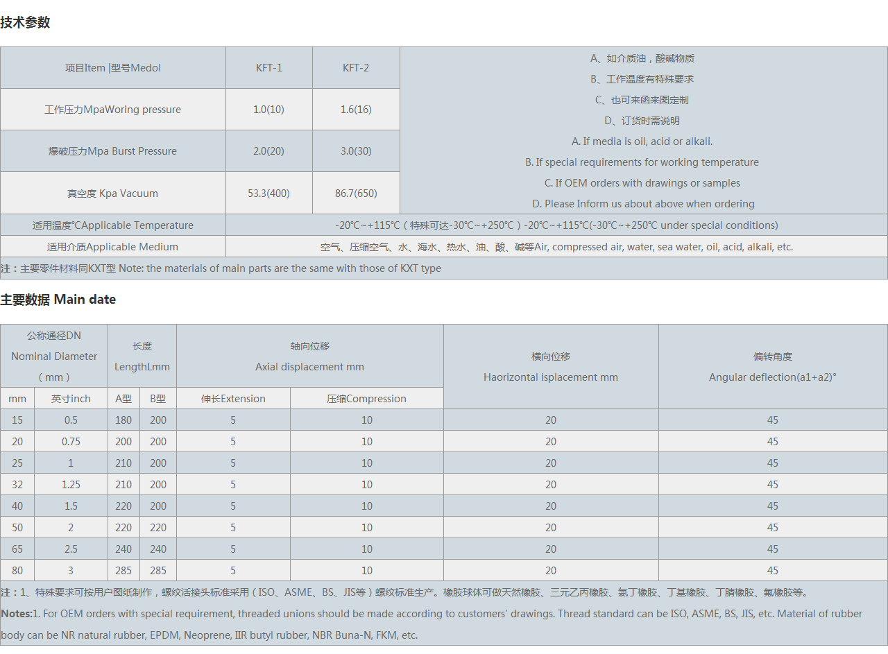 由于上海駱盈KFT絲扣橡膠接頭有良好的綜合性能,主要用于原水和污水的提升和輸送,火力發電廠的給水和冷卻循環水,冶金行業,冷凝水,化工行業的化學物質的管道輸送,石化行業的冷卻,稀釋及其它行業長短距離管線間的柔性連接。因為橡膠具有較高的耐磨性,還適用于行業的粒狀和粉狀及汽體的輸送。