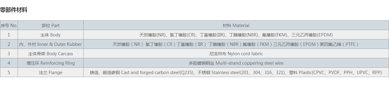 | 2 | 內(nèi)、外襯 Inner & Outer Rubber | 天然橡膠(NR) 氯丁橡膠(CR)丁基橡膠(IIR) 丁腈橡膠(NBR)氟橡膠(FKM)三元乙丙橡膠(EPDM)聚四氟乙烯(PTFE) |